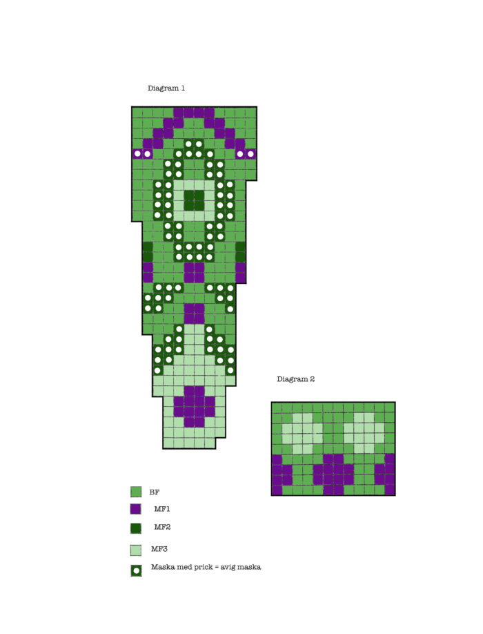 Här har mönsterfärg 4 (MF4) fallit bort. Den mörkgröna mönsterfärgen i oket skall vara Inlandsbanan 59024 eller Pine Tree Green 59008: 40 (45) 50 (55) 60 (65) 70 gram.